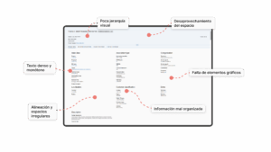 Ilustración 1 – Antes: Pantallas densas, sin jerarquía visual, con información desorganizada.
