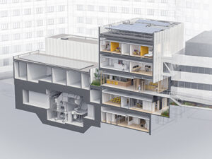 Therefore, this equipment presents radiation protection issues that are more typical of a nuclear facility than a conventional medical facility. In order for the facility to operate safely while taking into account the radiation risks, several measures must be taken in addition to shielding. These include appropriately classifying and signage for rooms, access control and security systems (e.g., door and beam interlocks, search systems*, emergency stop buttons, and cameras), and other systems that play an important role in safety, such as the ventilation system and fixed radiation measurement probes. These auxiliary systems and others, such as the electrical and cooling systems, are located in technical rooms that are usually situated above or around the bunker. Two important rooms for operating the facility are the control room, where the team’s operations are managed, and the storage room for radioactive waste and activated material. This room also requires structural shielding.