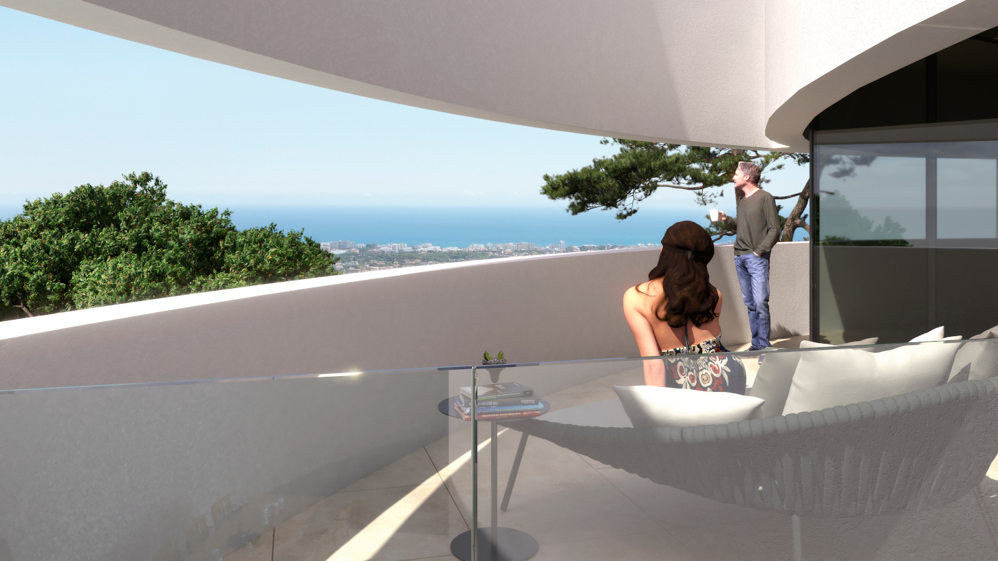 A villa that is a tribute to the cordial welcome to friends. A wonderful carob tree will illuminate the car park and a spiral wall accompanies the entrance with a gesture of warm embrace, and welcomes us, and leads us inside, to the roof, where the canvas of sunset colors is reflected to infinity in the pool